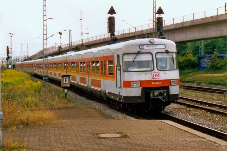 Hier fährt 420 458 auf der Linie S4 auf der Fahrt nach Marbach in den Bahnhof Zuffenhausen ein.
