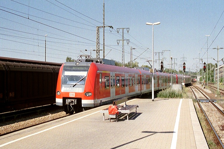 Im Gegenlicht habe ich 420 454 bei der Einfahrt in den Haltepunkt Nürnberger Straße erwischt. Er ist auf der Linie S4 unterwegs vom Flughafen nach Backnang.