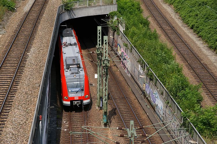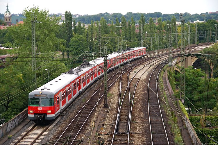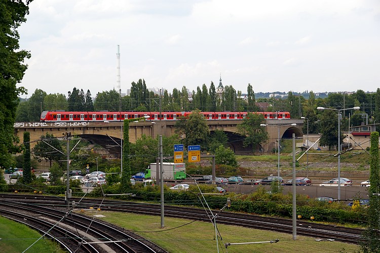 Hier noch ein Blick auf die Neckarbrücke. Der 420 474 fährt auf der Linie S1 und wird gleich im Rosenstein-Tunnel verschwinden, auf dessen Portal ich stehe.
