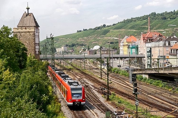 Auf seiner Fahrt auf der Linie S1 nach Plochingen hat der 423 335 den Bahnhof Esslingen verlassen. Links im Bild ist der Pliensauturm zu sehen.