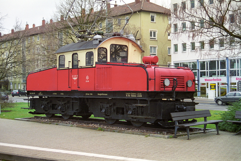 Beim Albtalbahnhof in Karlsruhe steht diese Elektrolokomotive auf einem Sockel. Es handelt sich um die Lok 2 der DEBG, Baujahr 1910. Die Lokomotive war bis 1962 im Dienst.