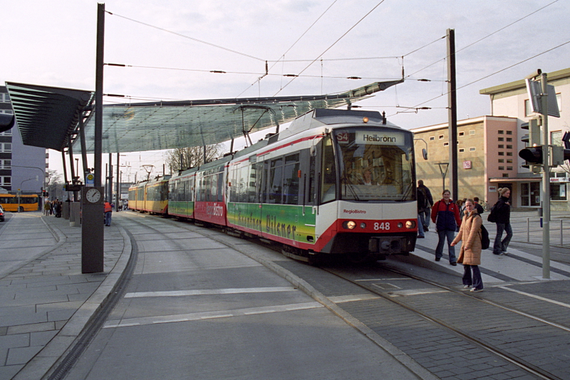 Die AVG fährt auf der Linie S 4 bis Heilbronn. Hier steht der GT8-100D/2S-M Nr. 848 an der Haltestelle Heilbronn Hbf.
