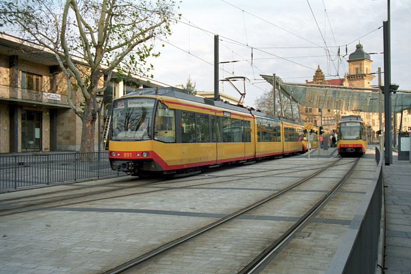 In Heilbronn an der Haltestelle Hauptbahnhof treffen sich der Stadtbahnwagen GT8-100D/2S-M "Panorama" Nr. 891 (links) und der GT8-100D/2S-M Nr. 857 (rechts).