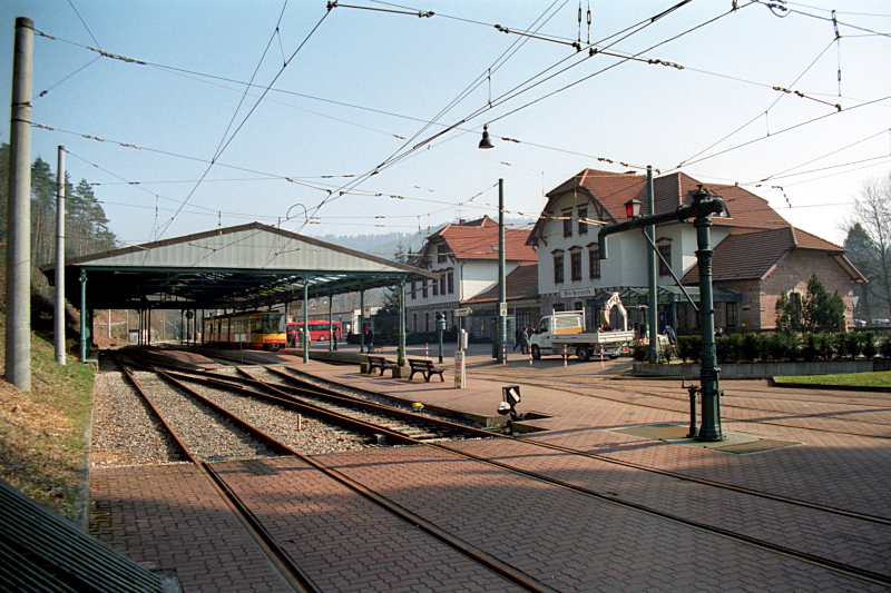 Die Bahnsteigüberdachung des Bahnhofs Bad Herrenalb stammt vom ehemaligen Bahnhof Baden-Baden - Stadt. Sie wurde nach der Stillegung der Stichbahn Baden-Baden-Oos nach Baden-Baden-Stadt nicht mehr benötigt.