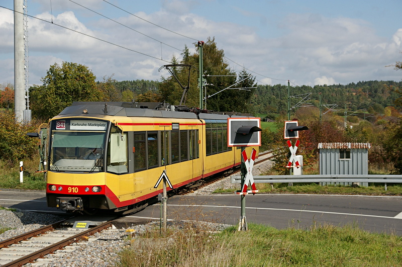 Bei Altheim ist der GT8-100D/2S-M "Panorama" Nr. 910 unterwegs. Er befindet sich auf dem Weg von Eutingen nach Karlsruhe.