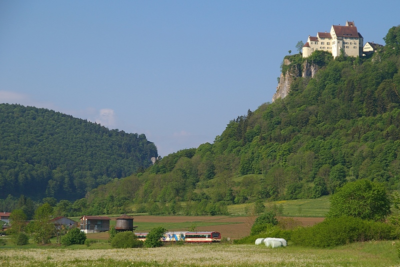 Die Burg Werenwag und der alte Wasserturm in Hausen im Tal geben auch ein gutes Motiv ab. Der NPE kommt aus Tuttlingen zurück, und fährt in den Bahnhof Hausen ein.