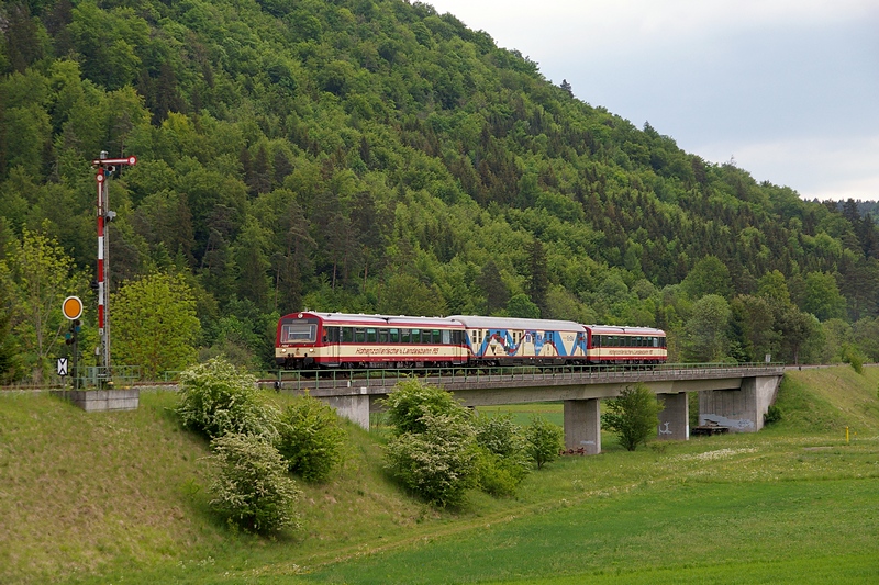Vom "Gespaltenen Fels" (bei Laiz, 675 m ü.N.N.) hat man noch einen einigermaßen guten Blick auf die Donautalbahn. Hier ist der Naturparkexpress, welcher von Tuttlingen nach Sigmaringen unterwegs war, zu sehen.